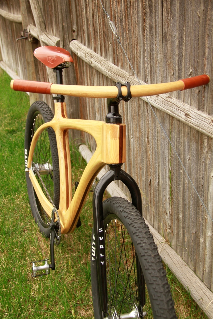 I’m still revising the specific components to be used on the first production model, however here are some of the working photos. This shows the bike in it’s “Mountain Scorcher” configuration. Note the long fork and knobby tires. The true “Woody Scorcher” configuration will appear soon sporting a lower, sleeker fork and fast slick balloon tires.